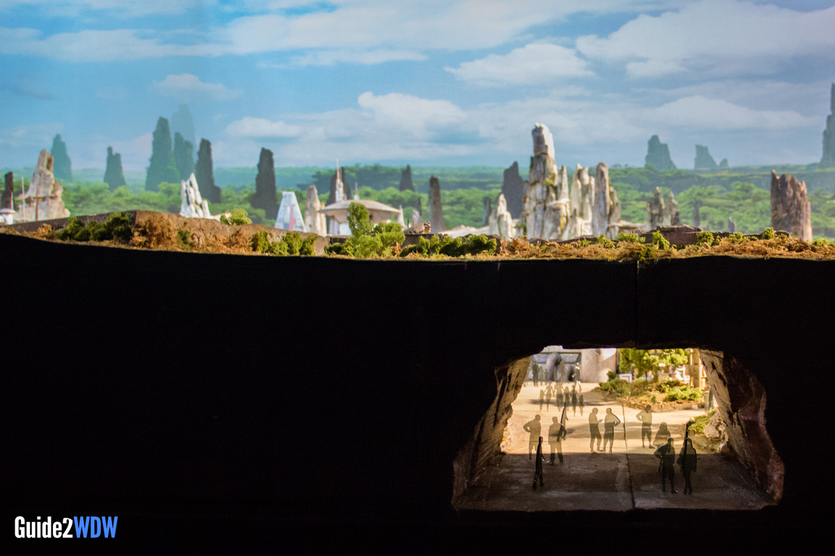 The model on display is the Disneyland version, and the Imagineers made it clear that there are actually not too many significant differences between Star Wars: Galaxy’s Edge at Disneyland and Disney World. The main difference they emphasized was that Disneyland’s has three entrances (going from left to right on the model: Critter Country, Big Thunder Trail, and Fantasyland), while Hollywood Studios feature two entrances into the land.