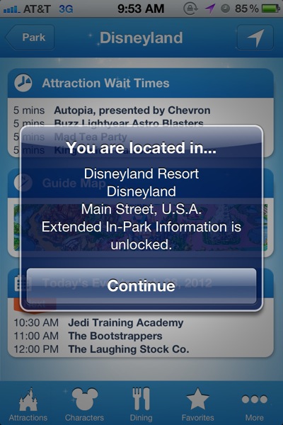 There were a couple of other small gripes: My cell coverage at Disneyland was hit or miss, so sometimes I would see a “we are still gathering data” screen. It didn’t happen extremely often, and it’s not really the app’s fault. Also, the navigation could use some retooling. Much like the Disneyland Explorer App for the iPad, Disney World’s iPhone app should include a pop down navigation menu to more easily access the parts of the app you want to get to.