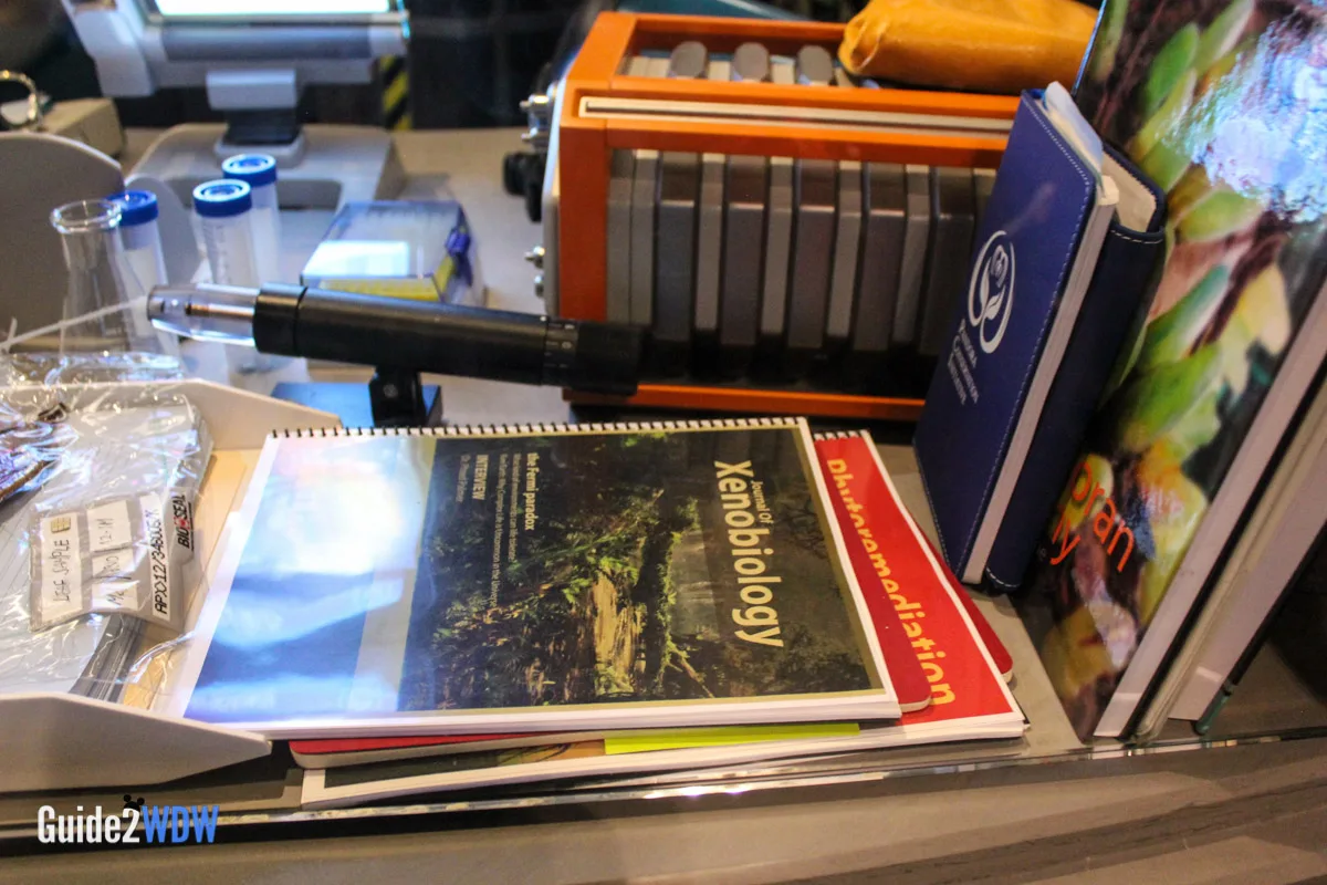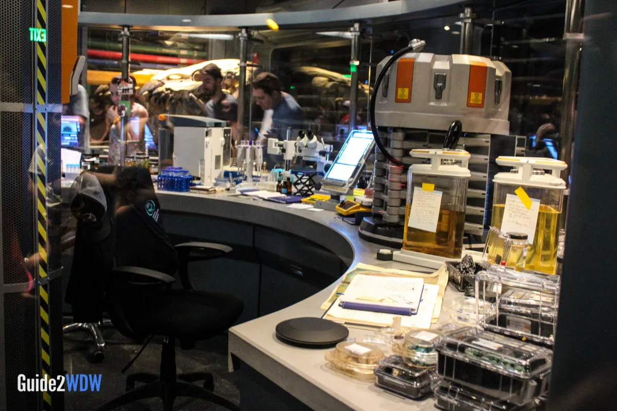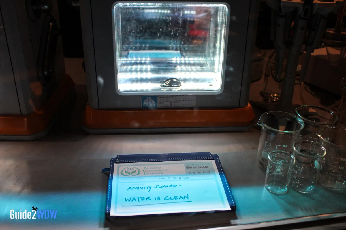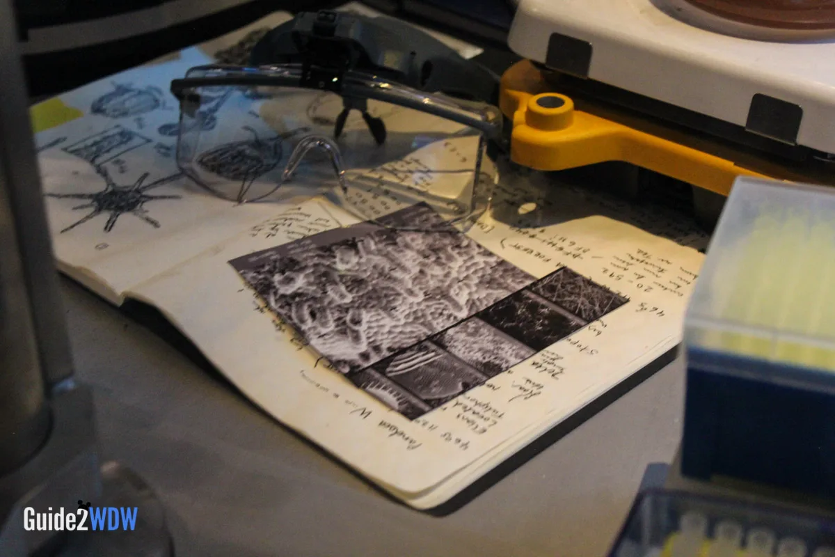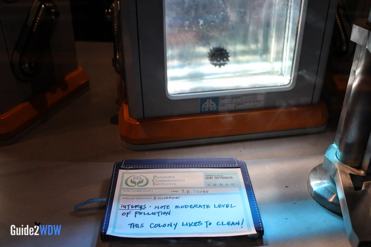 When you enter the queue for Flight of Passage, you initially walk into something that looks like a cave with lots of plants. As you go, you find an old research facility that plants have overtaken, so it’s a mixture of the natural and manmade. Have you ever seen pictures of those old theme parks that get overrun by plants because no one has been there for awhile? It feels a little bit like that. Then as you keep going, you eventually get to the inner research facility where you see an actual Avatar along with notes and experiments of the researchers. The entire queue is really fascinating! I found myself taking a ton of pictures of the queue because there’s so much to look at.