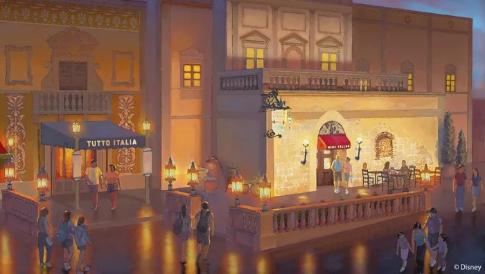 If you’ve visited the Italy Pavilion at Epcot recently, you’ve noticed that Tutto Italia has been boxed off behind construction walls. However, come early May, the popular eatery will reopen to Walt Disney World guests with a major addition: Tutto Gusto Wine Cellar. Disney Parks Blog revealed an artist’s rendering of the new layout of Tutto Italia and Tutto Gusto, which is positioned where the old lobby for Tutto Italia used to be.